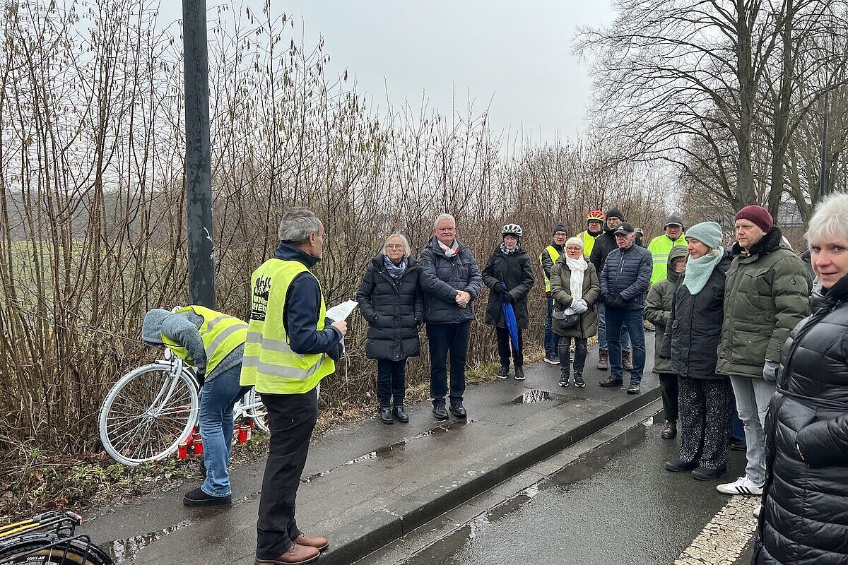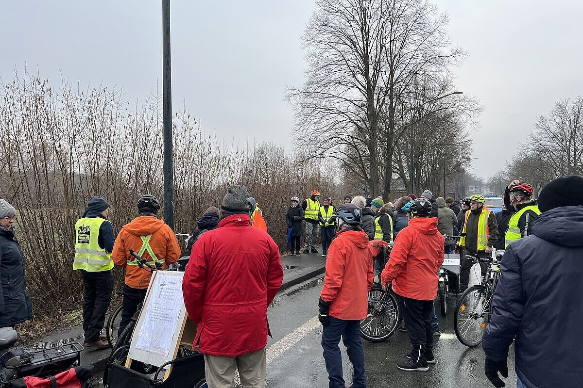 Aufgrund der extremen Glätte entschied sich die Gruppe kurzfristig um: Etwa die Hälfte der Teilnehmer war ohne Rad erschienen, sodass der Demonstrationszug zu Fuß vom Herringer Markt zur Unfallstelle auf der Fangstraße zog. Unter den Anwesenden waren neben ADFC-Mitgliedern und engagierten Bürgern auch ehemalige ArbeitskollegInnen des Verstorbenen die ihre tiefe Anteilnahme ausdrückten.