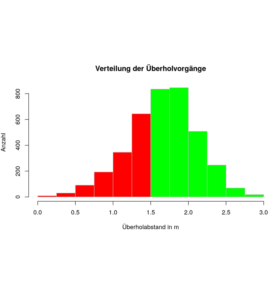 Die durch den OpenBikeSensor erfassten Daten verdeutlichen das Ausmaß der Problematik. Der Sensor, der mithilfe von Ultraschall den seitlichen Abstand zwischen Fahrrad und überholendem Fahrzeug misst, wurde im Rahmen des Projekts an Fahrrädern von Freiwilligen installiert. Auf einer Gesamtstrecke von 4.392 Kilometern wurden fast 3.900 Überholvorgänge dokumentiert. Bei einem Drittel dieser Überholmanöver wurde der Mindestabstand von 1,5 Metern nicht eingehalten. Die Verteilung der gemessenen Abstände zeigt: